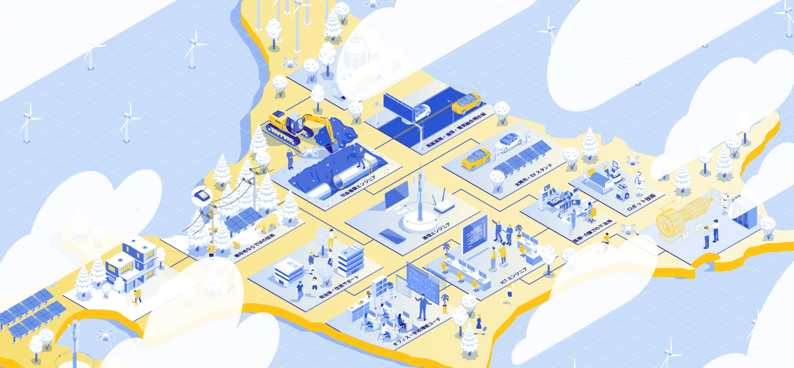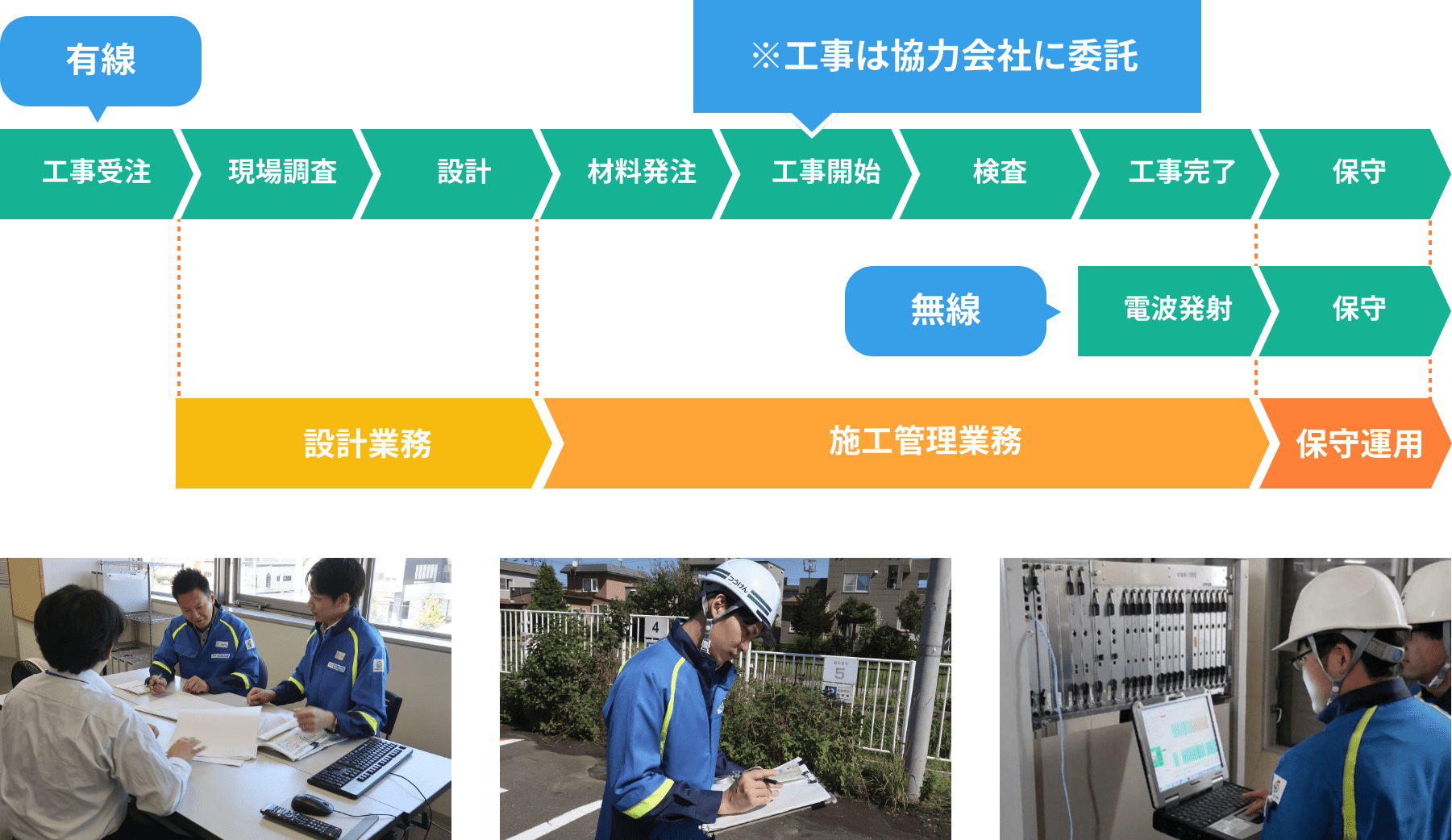 通信事業部は、光回線や携帯基地局の設置工事を行い、安定した通信環境を守ります。ICT事業部は、お客様や社会が抱える課題をICTソリューション技術を使って解決します。社会基盤事業部は、電線やケーブル等の設置に欠かせない土木工事を行います。いずれの仕事でも、営業から設計、施工、保守・点検まで自社で一貫して行えることが、大きな強みです。